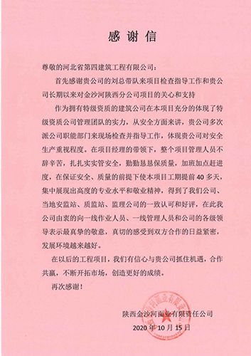 10月22日,四分公司收到陜西金沙河項(xiàng)目部業(yè)主單位致公司的感謝信和錦旗,以及武功縣住房和城鄉(xiāng)建設(shè)局、監(jiān)理單位贈(zèng)送的錦旗。