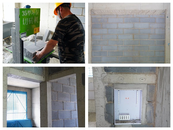 在材料利用與成本控制方面,項(xiàng)目團(tuán)隊(duì)探索出了“更優(yōu)解”。針對(duì)頂部斜砌施工,項(xiàng)目部原計(jì)劃采購混凝土預(yù)制塊進(jìn)行砌筑,但在論證中發(fā)現(xiàn)采購的預(yù)制塊存在成本高、運(yùn)輸損耗大、工序銜接慢等弊端。經(jīng)過反復(fù)研討,項(xiàng)目團(tuán)隊(duì)決定就地取材,利用現(xiàn)場(chǎng)加氣混凝土砌塊施工剩余的裁切廢料,通過定型化切割模具進(jìn)行精準(zhǔn)切割,替代外購預(yù)制塊。為保障方案順利實(shí)施,項(xiàng)目部提前抽調(diào)技術(shù)嫻熟的切割工,組織加氣塊切割專項(xiàng)培訓(xùn),同時(shí)提前安裝調(diào)試好40余臺(tái)高精度切割設(shè)備,現(xiàn)場(chǎng)切割作業(yè)得以高效展開。這一創(chuàng)新方法的運(yùn)用,將加氣塊材料的現(xiàn)場(chǎng)利用率提高到90%以上,其切割面更加平整,有效保障了斜砌質(zhì)量和結(jié)構(gòu)整體性,提升了觀感效果。